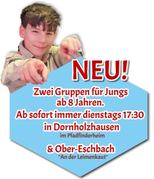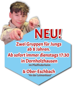 Gründung eines zweiten StandortsDrei unserer Jungs Gründen eine neue Gruppe in Ober-Eschbach für Jungs ab 8 Jahren. Gruppenstunde ist dienstags von 17:30 - 19:00 Uhr. Im neuen Gruppenraum, einem Raum im Gemeindehaus „an der Leimenkaut“. Stammesführer für alle Fragen spezifisch des Programms in Ober-Eschbach, ist Elias Calderon. Erreichbar unter:nibelungen[ät]taunuspfadfinder.de